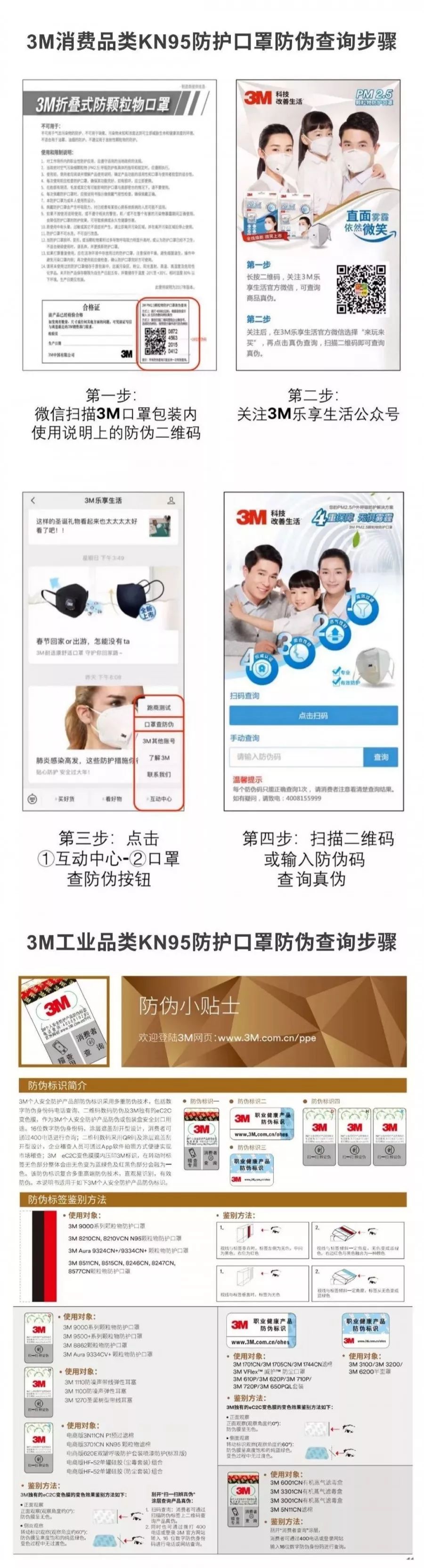 如果是買(mǎi)到盒裝3M N95/KN95系列口罩的話,可以通過(guò)上圖步驟,在3M樂(lè)享生活公眾號(hào)查詢防偽碼驗(yàn)證真?zhèn)巍?/span>