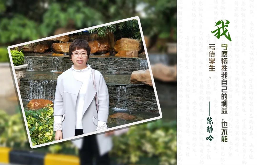 在陳靜吟的求學(xué)生涯中,每一個(gè)階段,都非常幸運(yùn)地遇到了許多為她指點(diǎn)迷津、引領(lǐng)方向的老師,小學(xué)的班主任許實(shí)鵬老師、初中的班主任陳堅(jiān)老師、高中的班主任陳良進(jìn)老師以及大學(xué)的劉毅老師,他們有的教會(huì)她堅(jiān)強(qiáng)勇敢地面對(duì)挫折,有的教會(huì)她以身作則、親力親為的示范作用遠(yuǎn)比說教更勝百倍,有的教會(huì)她豁達(dá)的生活態(tài)度,而無一例外的,他們都教會(huì)了陳靜吟在教學(xué)生涯中需“用真情換取真情,以心靈喚醒心靈”的態(tài)度,猶如燈塔一般,明確地指引著前進(jìn)的方向。