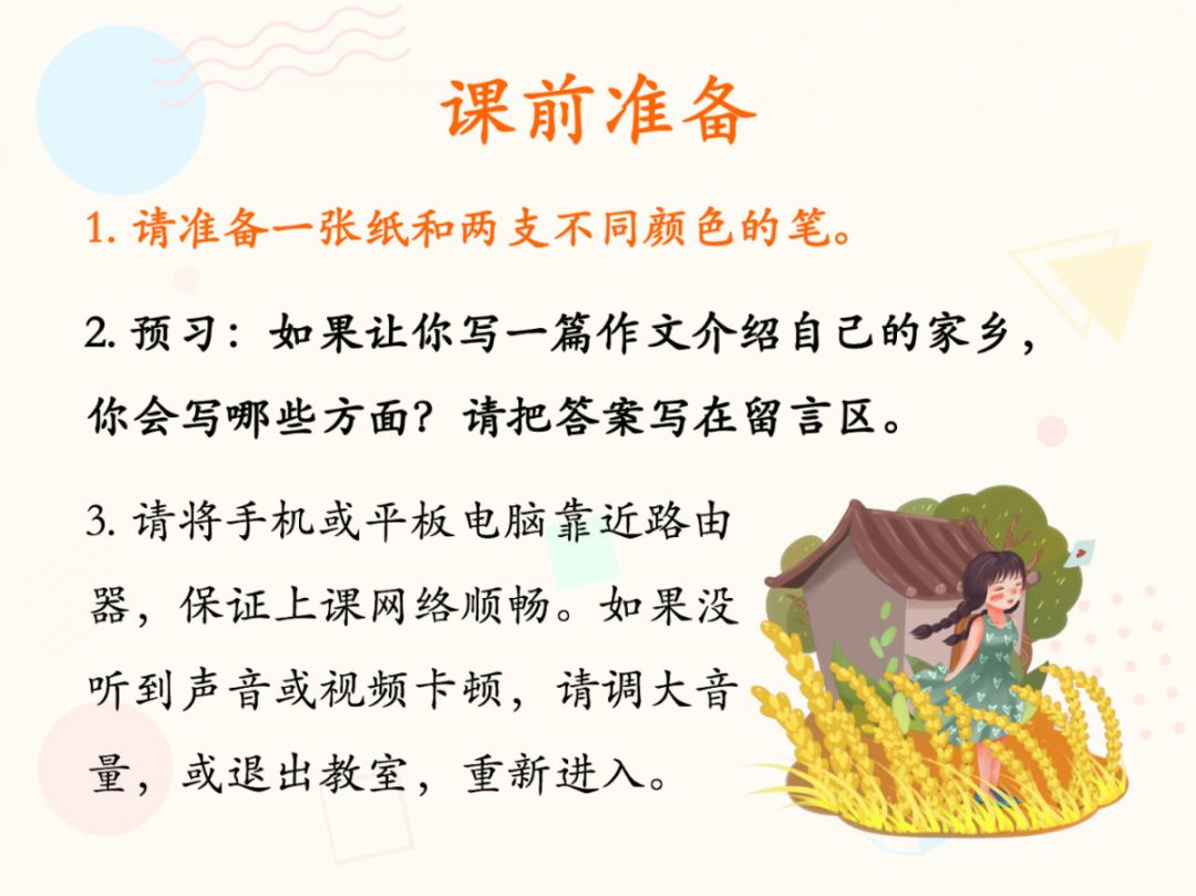 比如說這節(jié)課是下午三點(diǎn)開始,在2點(diǎn)50的時(shí)候,您就可以上線了,您可以提前10分鐘做一張PPT,把今天的預(yù)習(xí)內(nèi)容,以及網(wǎng)絡(luò)條件怎樣才能保持通暢的注意事項(xiàng)發(fā)給孩子們。