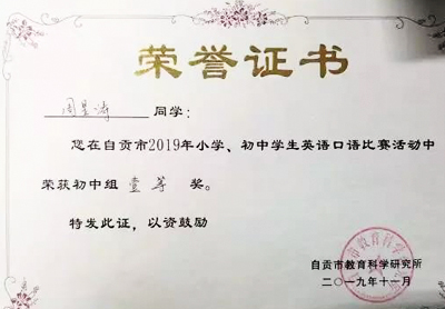 川貢衡川,我校學(xué)子喜獲自貢市初中生英語(yǔ)口語(yǔ)比賽一等獎(jiǎng)