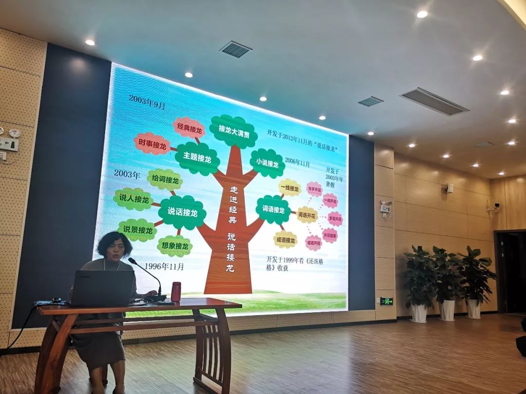 課堂結(jié)束后,丁老師又在階梯教室進(jìn)行了《說話接龍之積累、激活、應(yīng)用》的講座,和老師們分享了“生字開花 ”“說話接龍”教學(xué)的意義和具體實施方法。