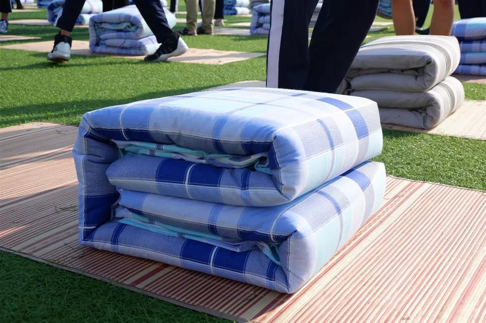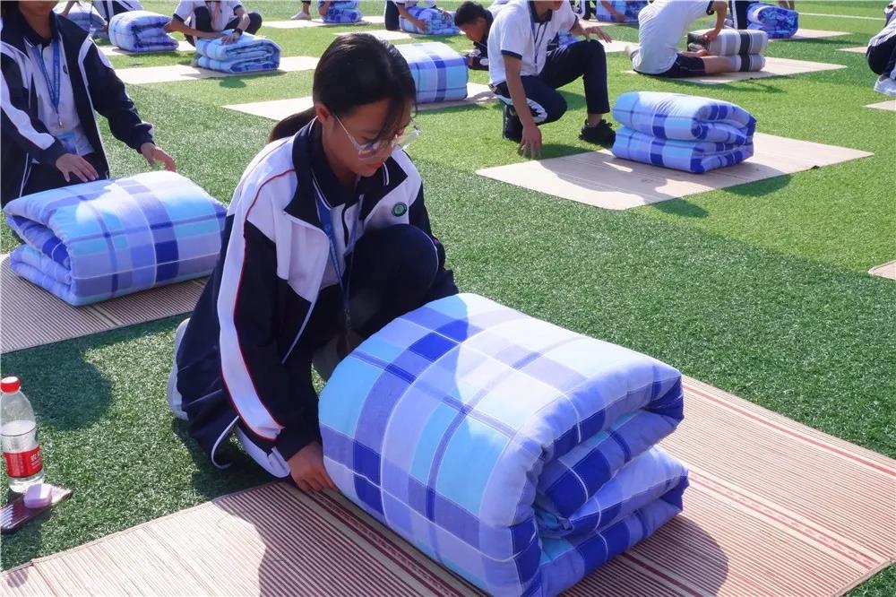 活動開場,全體師生奏唱校歌,很快激烈的疊被子比賽開始了。比賽實行分組對抗淘汰制,三局定勝負。
