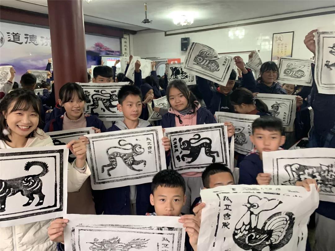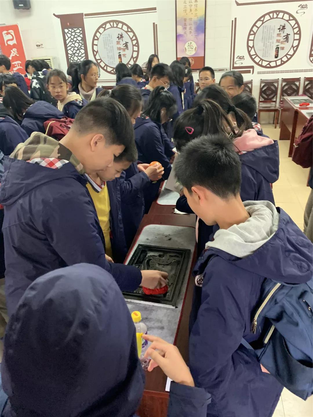 再看看,生肖拓印現(xiàn)場(chǎng)的同學(xué)們也非常認(rèn)真。在講解員的精心講解后,同學(xué)們用小盆中的刷子蘸取墨汁在拓板上從上到下的刷。最后用宣紙覆蓋在上面,再用小的紅色物品輕輕的按壓,形成成品??粗粡垙堄H手拓印的生肖畫,同學(xué)們可開心了!據(jù)說, 還有同學(xué)專門為自己父母拓印了生肖圖呢!