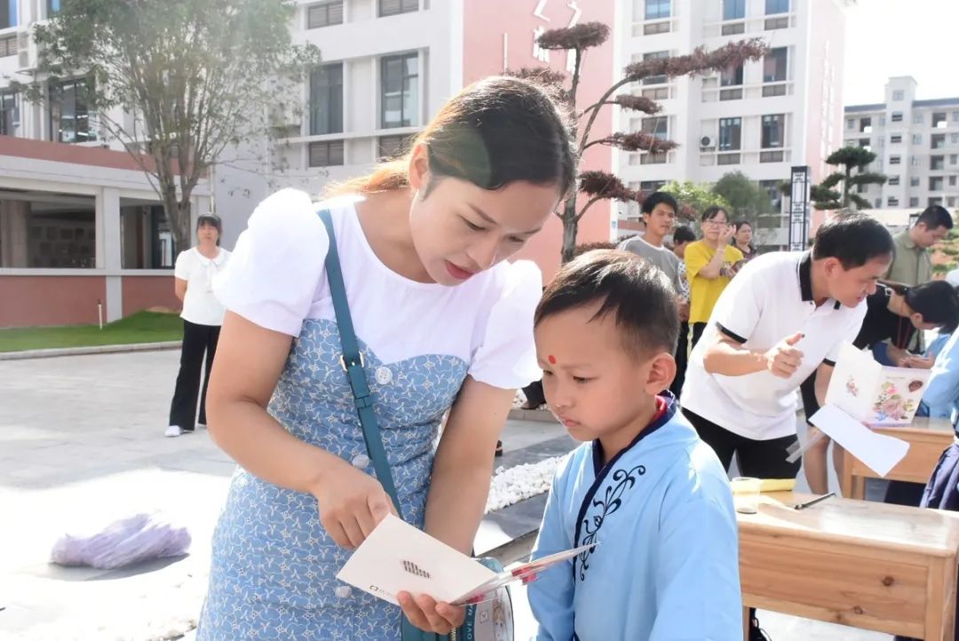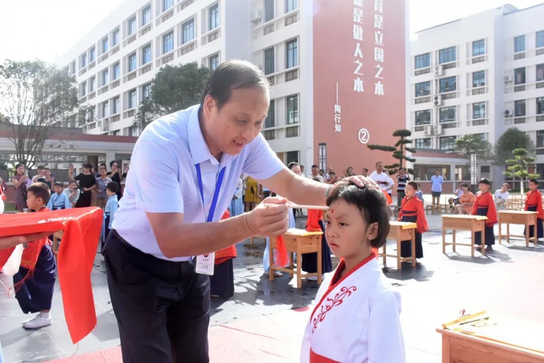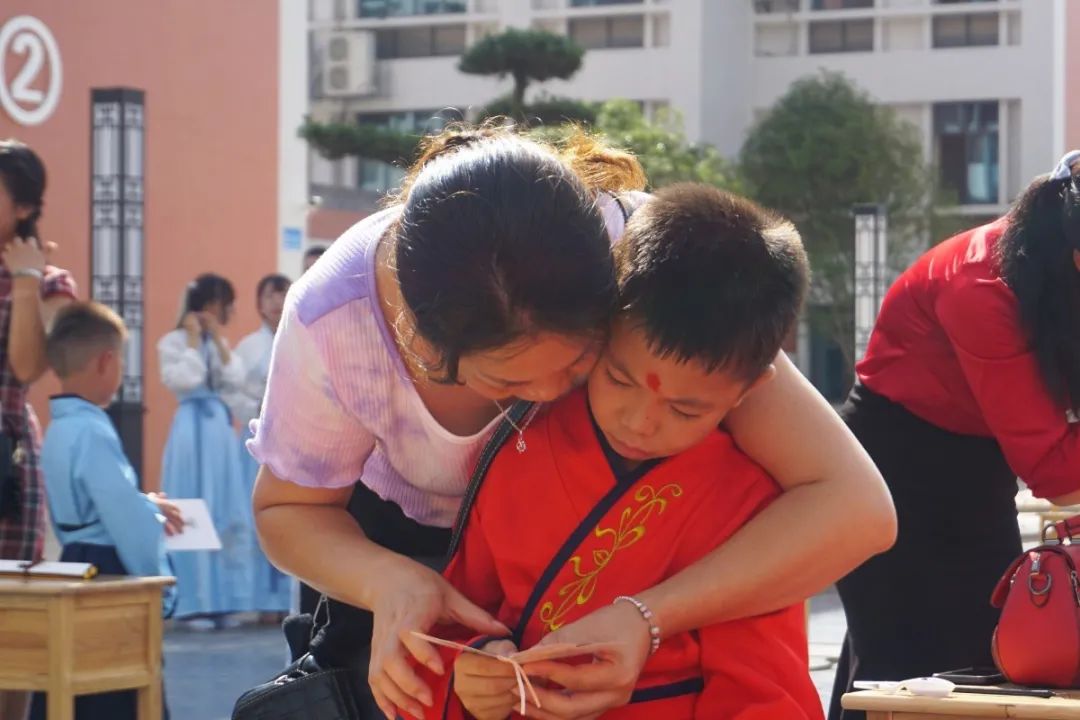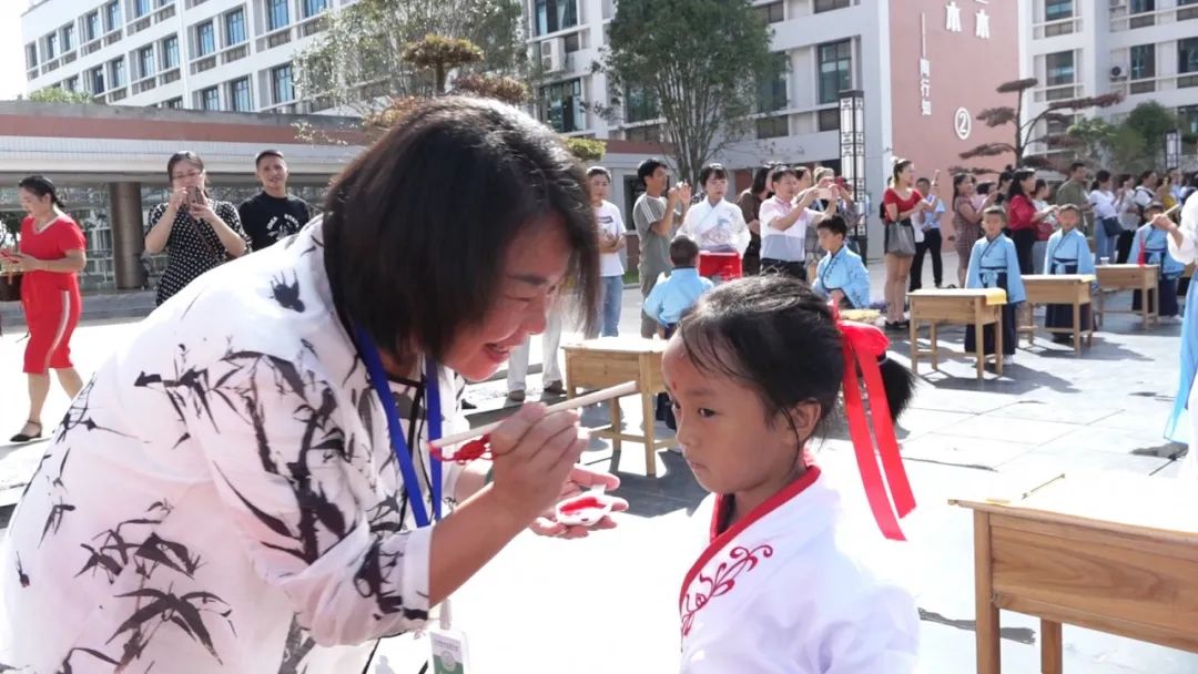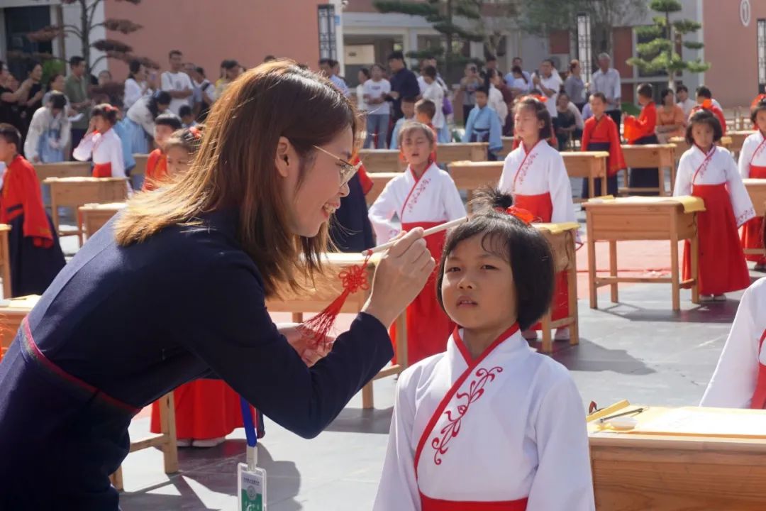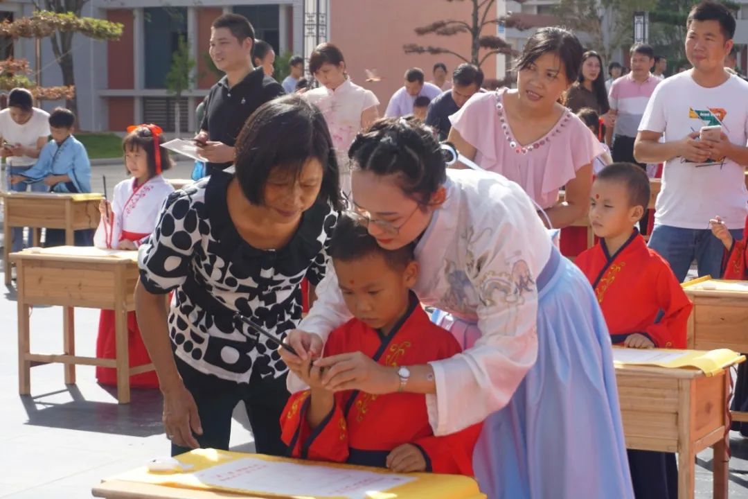學(xué)校領(lǐng)導(dǎo)和老師們俯下身子,笑意盈盈地逐個(gè)為孩子們點(diǎn)朱砂,一張張稚氣的臉上多了一分靈氣和自信。