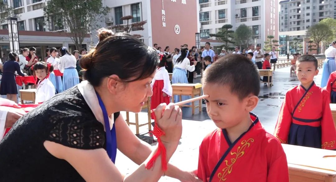 點(diǎn)朱啟智,心明眼亮,景行唯圣,教倫無痕。師者用筆粘上朱砂,于孩子眉心之上輕輕一點(diǎn),謂之“點(diǎn)智破蒙”,寓意開啟智慧,推開知識(shí)的大門,祈愿新生們從此心明眼亮,好好讀書,端正品行,健康成長。