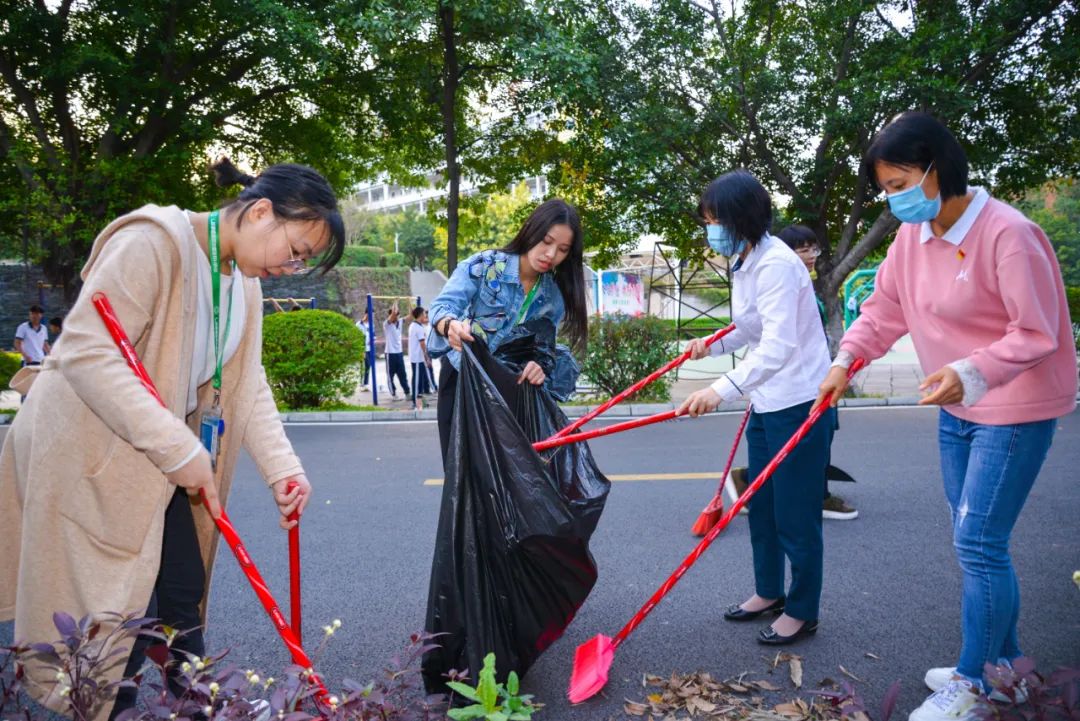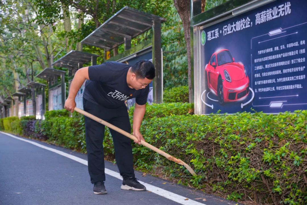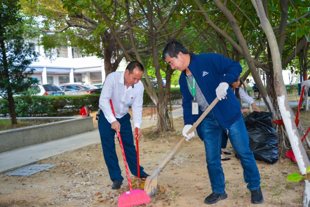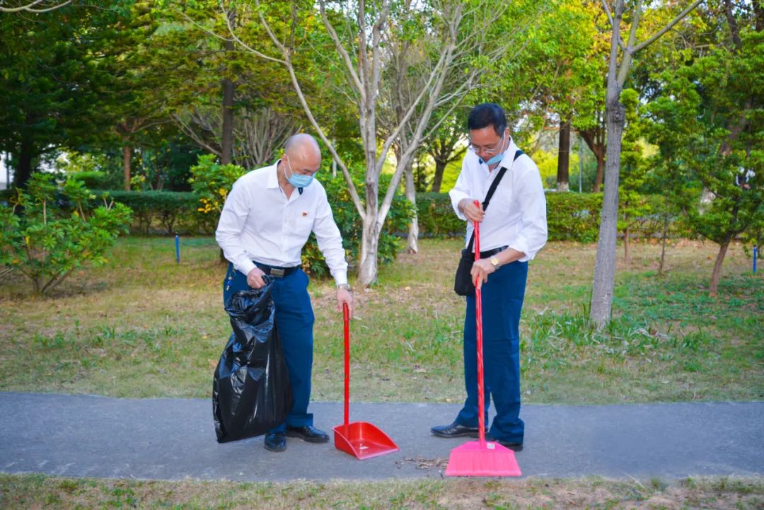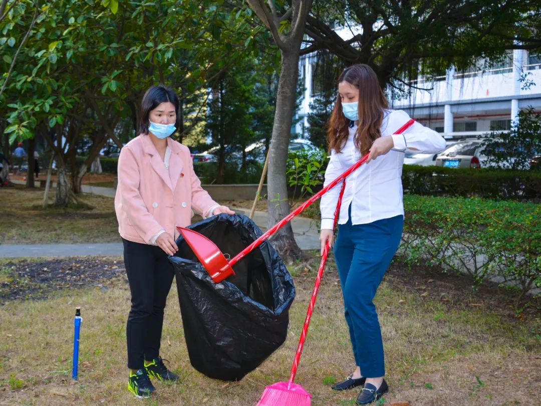 簽約儀式結(jié)束后,兩個黨支部全體黨員分成4個小組,聯(lián)合開展校園衛(wèi)生清潔活動。