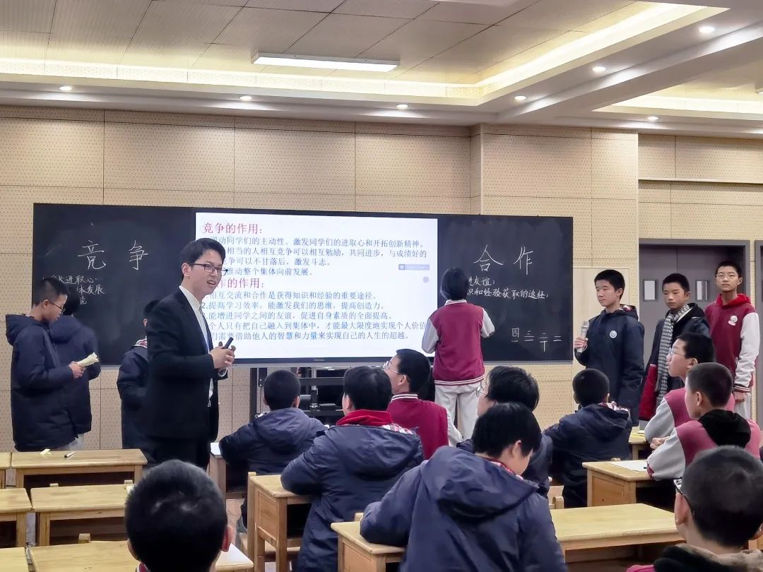 七六班班主任常雪晴老師和七四班班主任李金龍老師,實現(xiàn)了班會課的同題異構(gòu),都已《競爭與合作》為主題,共同探討了競爭與合作的關(guān)系。